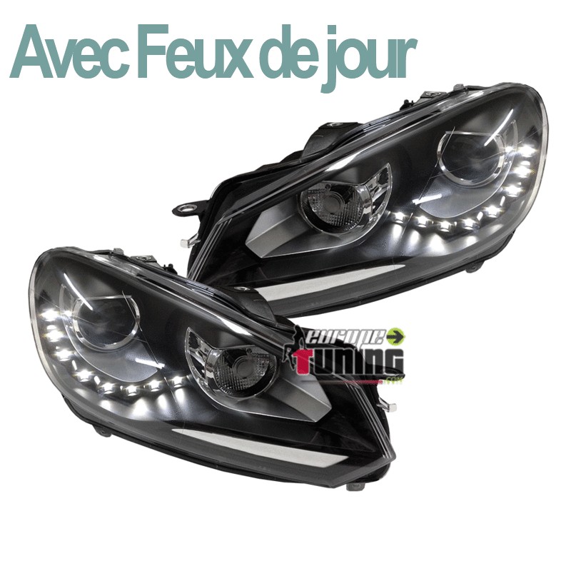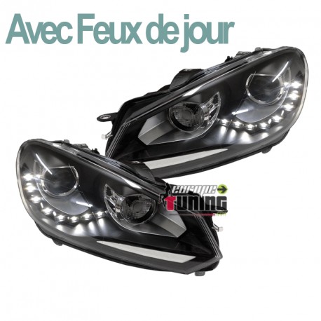 PAIRE DE PHARES AVEC FEUX DE JOUR (DIURNE - DRL - R87) SUR FONDS NOIRS LOOK PACK GTI AU XENON POUR VOLKSWAGEN GOLF VI