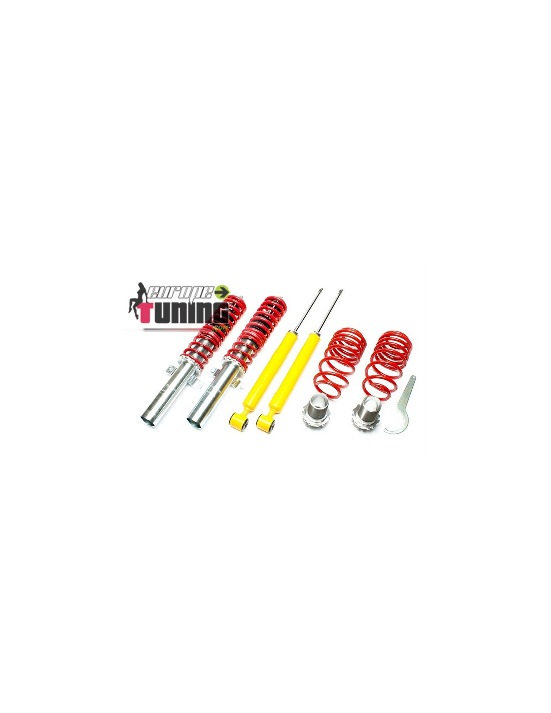 Kit Complet de 4 amortisseurs avec ressorts. Le kit comprend aussi une clé de réglage pour la hauteur