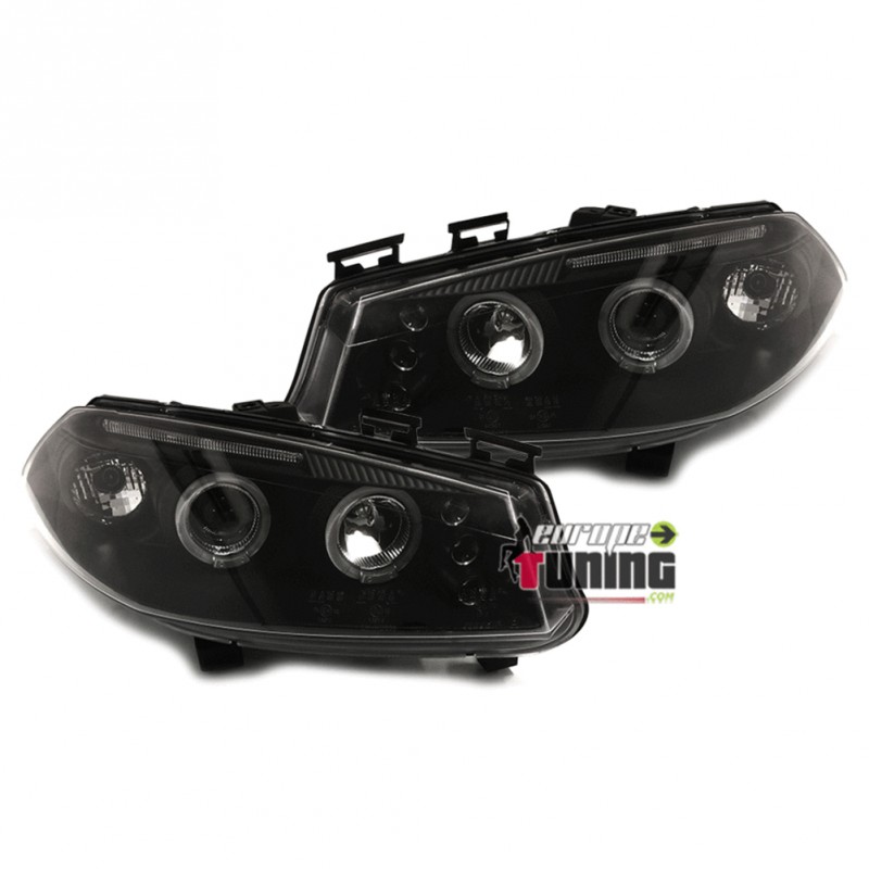 PAIRE D'OPTIQUES DE PHARES AVANTS NOIRS "ANGEL EYES" A ANNEAUX LED + 3 PETITES VEILLEUSES